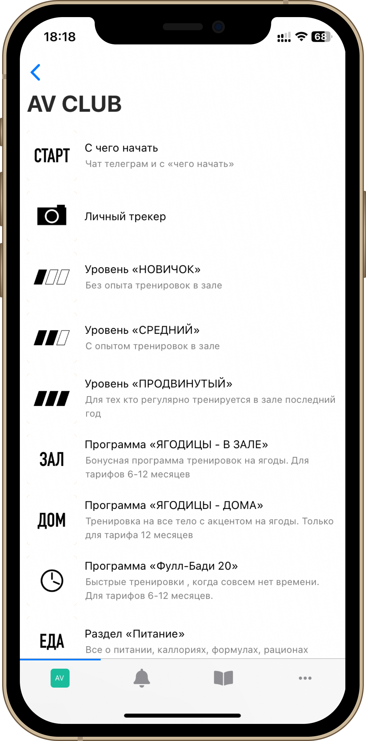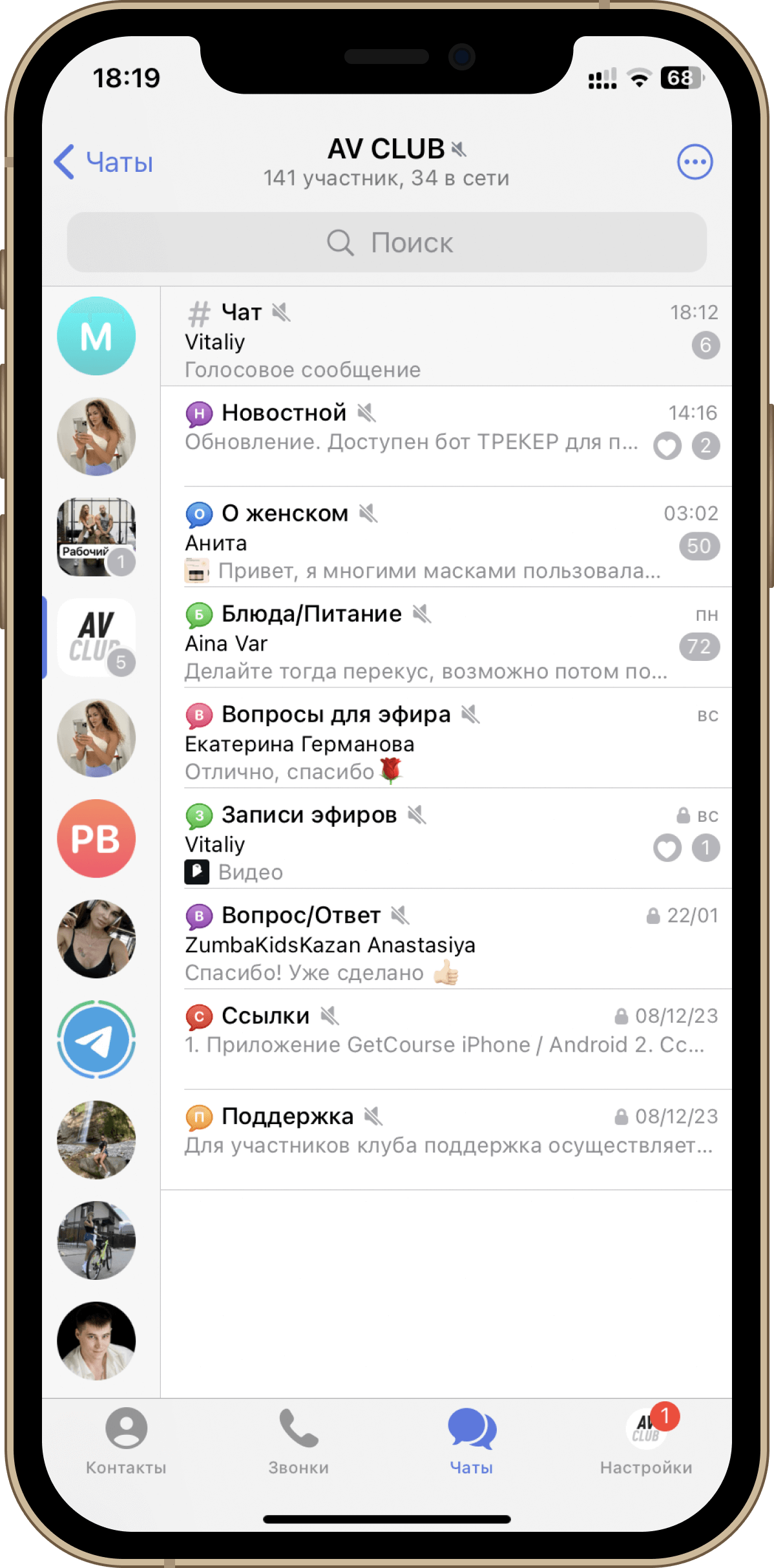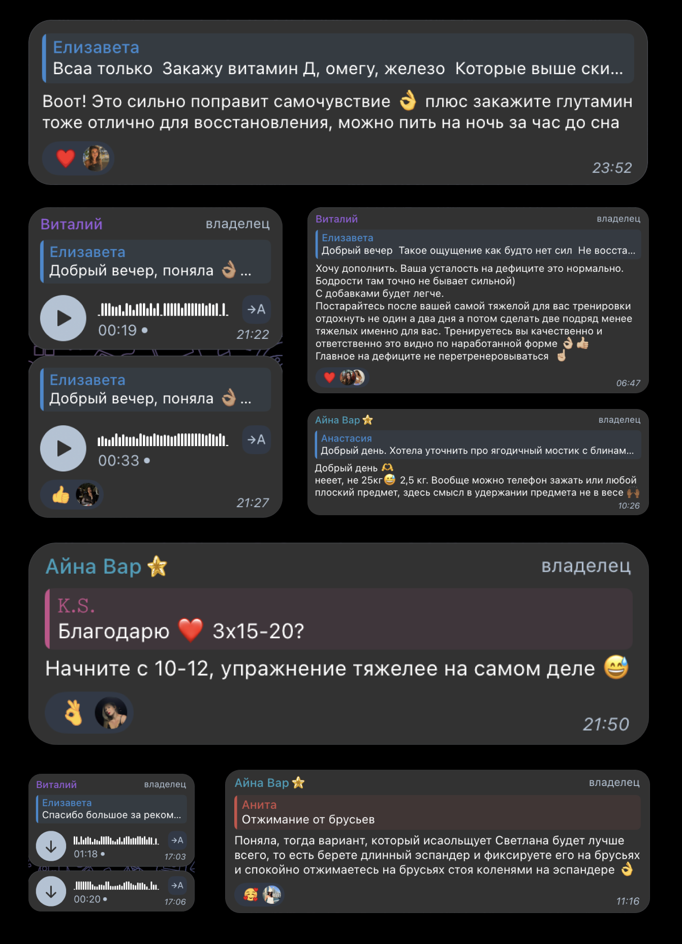 Клубный чат в телеграм с 7 разделами, в котором мы: Айна и Виталий лично даем обратную связь каждой участнице, проверяем упражнения, помогаем с техникой и питанием.